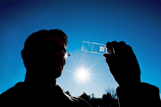 Sandia researcher Greg Nielson with “glitter-sized” solar cells. (Photo by Randy Montoya)