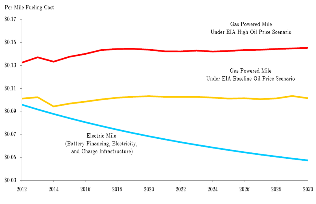 The difference increases with the inevitable rise in the price of oil. EV operation becomes even more attractive compared to gasoline-powered cars with a decline in the cost of electricity. That’s based, in part, on technological improvements that make batteries more efficient.