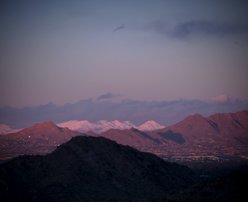 While I didn’t see any snowflakes in Phoenix yesterday (there are reports that some areas got a few flakes), I did get a nice view of snow-capped peaks in the Mazatzal Range, about 50 miles northeast of Phoenix. That’s Mount Ord — wearing the white hat and farthest to the right (south) in the distance. It’s 7,128 feet. I took the photo five minutes before the sun set — with just enough time to hike down from the saddle below Piestewa Peak and hustle back on the trail to my car — with enough light to avoid gathering chollas spines.